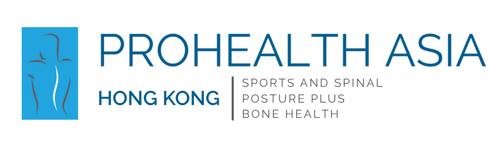 ProHealth Asia Hong Kong logo featuring stylized human spine outline with blue colors and text emphasizing sports, spinal posture, and bone health.